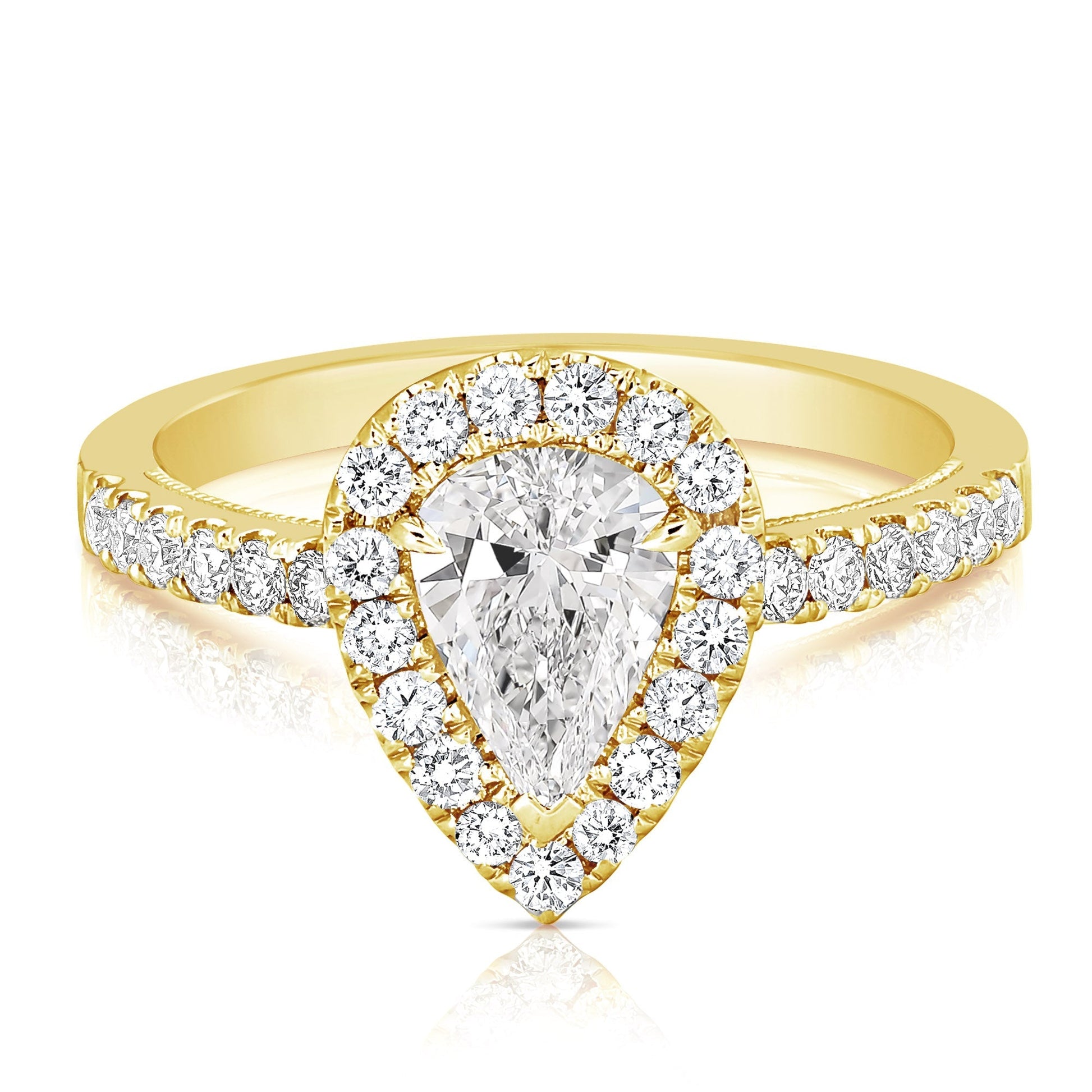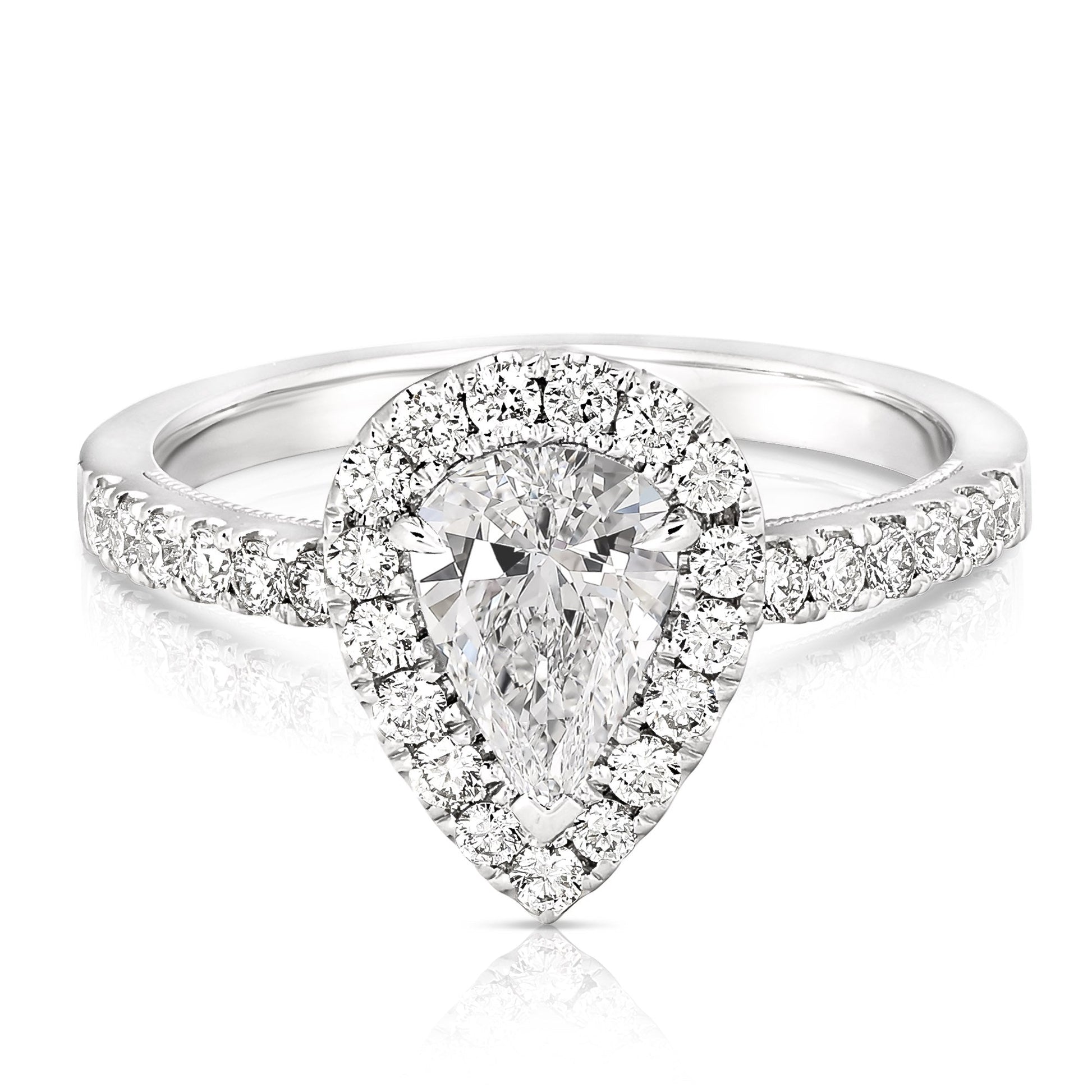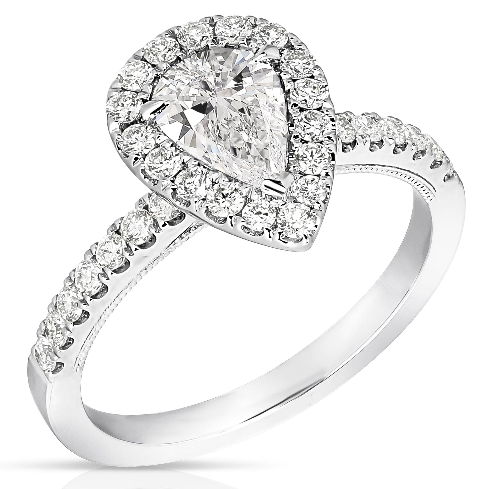 Turn heads with this trendy engagement ring. Ring features one pear cut shape diamond, centrally prong set, surrounded by round brilliant cut diamonds pave' set in the halo and shoulders of the ring. Totaling 1 1/4CT TW.