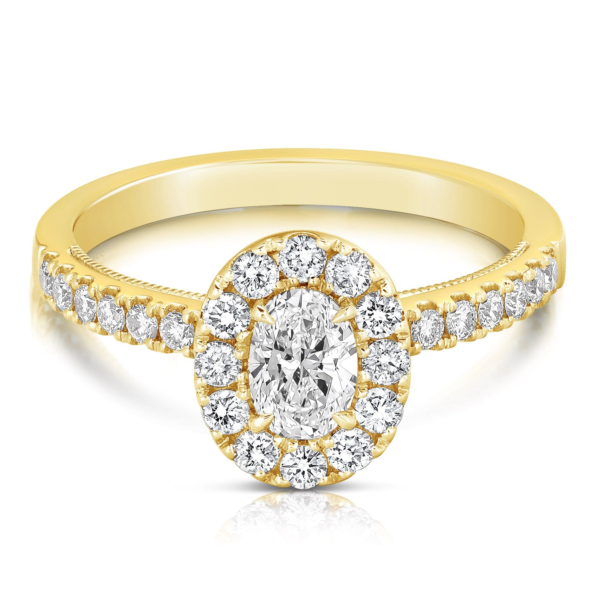 Turn heads with this trendy engagement ring. Ring features one oval cut shape diamond, centrally prong set, surrounded by round brilliant cut diamonds pave' set in the halo and shoulders of the ring. Totaling 1/2CT TW.