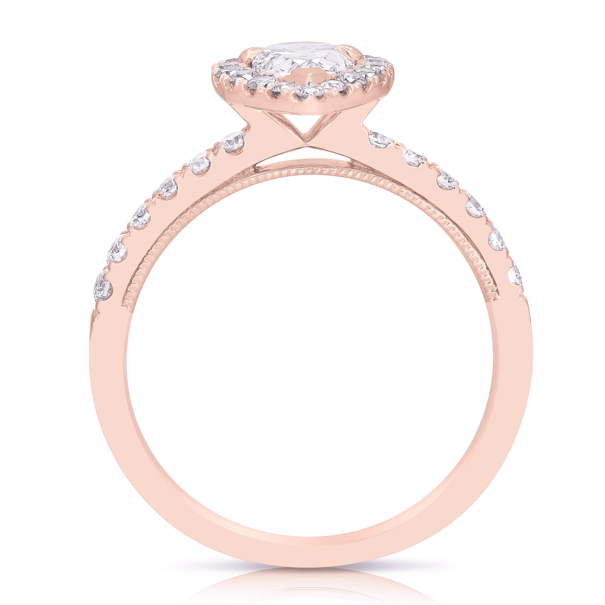 Turn heads with this trendy engagement ring. Ring features one pear shape diamond, centrally prong set, surrounded by round brilliant cut diamonds pave' set in the halo and shoulders of the ring. Totaling 1/2CT TW.