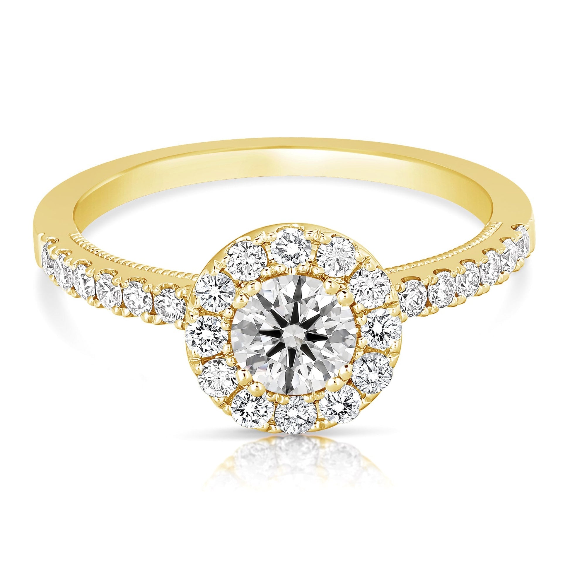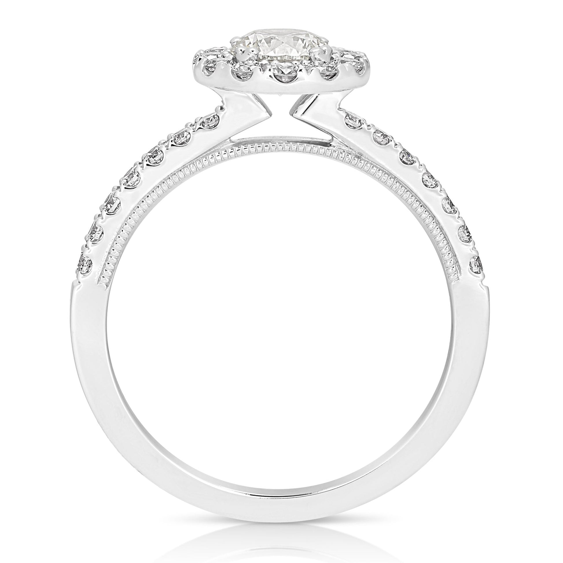Turn heads with this trendy engagement ring. Ring features one round brilliant cut diamond, centrally prong set, surrounded by round brilliant cut diamonds pave' set in the halo and shoulders of the ring. Totaling 1/2CT TW.
