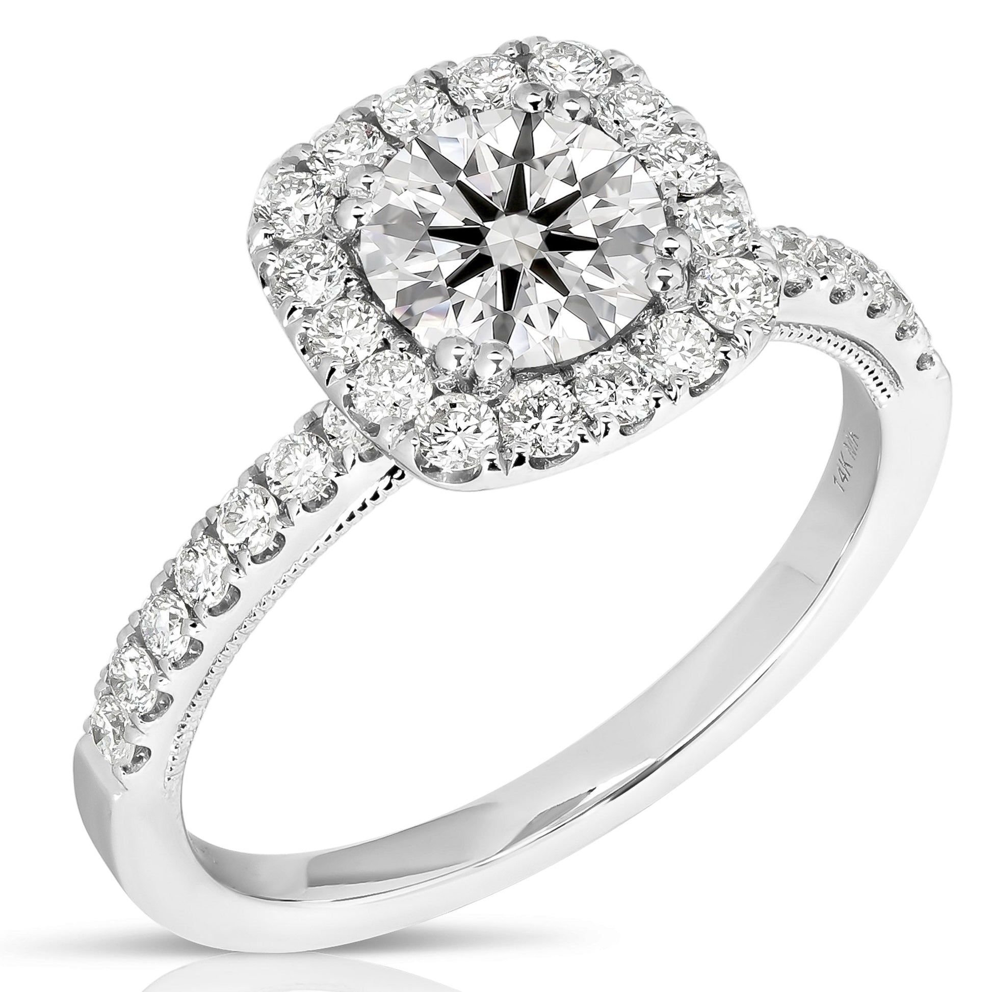 Turn heads with this trendy engagement ring. Ring features one round brilliant cut lab-grown diamond centrally prong set, surrounded by lab-grown round brilliant cut diamonds pave' set in the cushion halo and shoulders of the ring. Totaling 2 1/2CT TW.