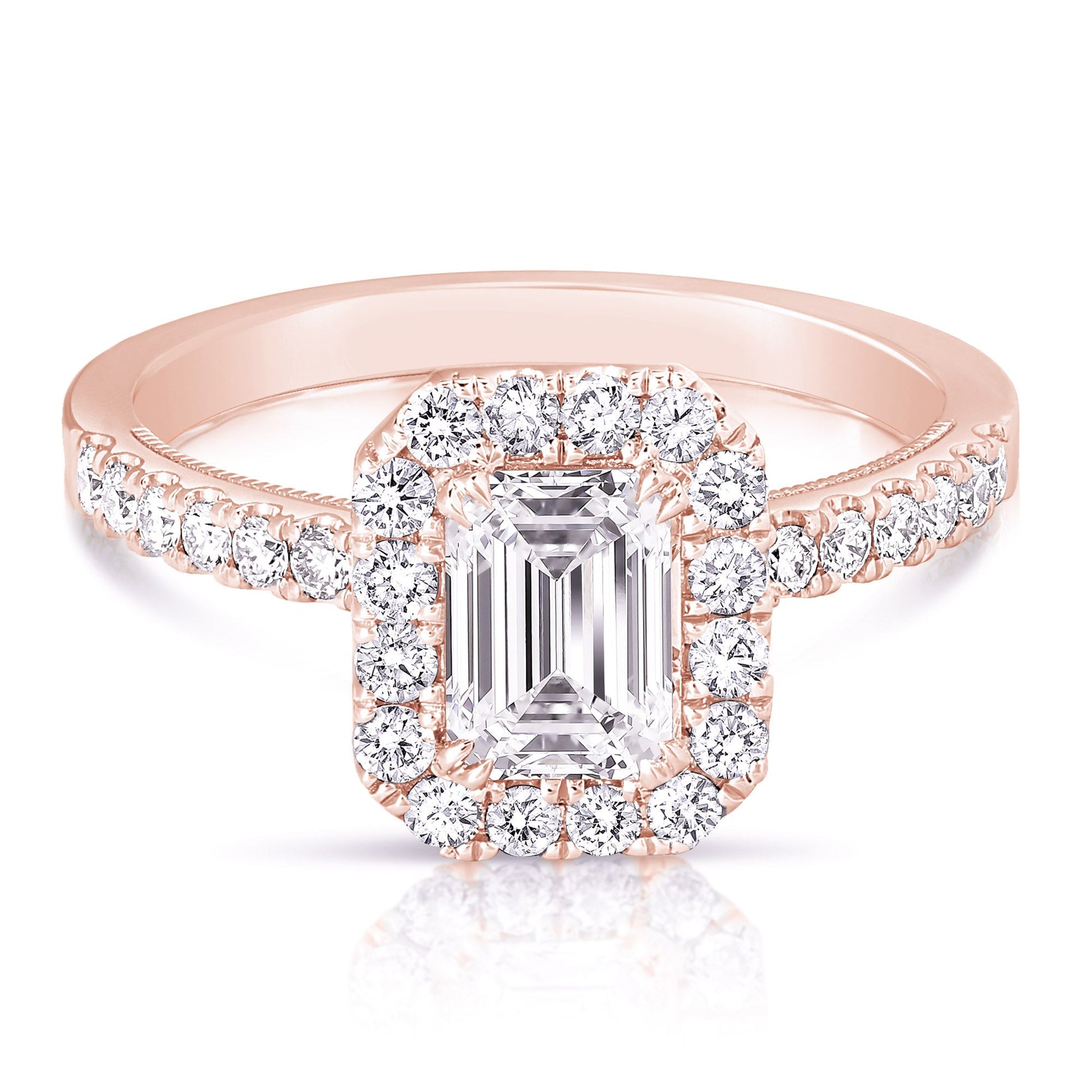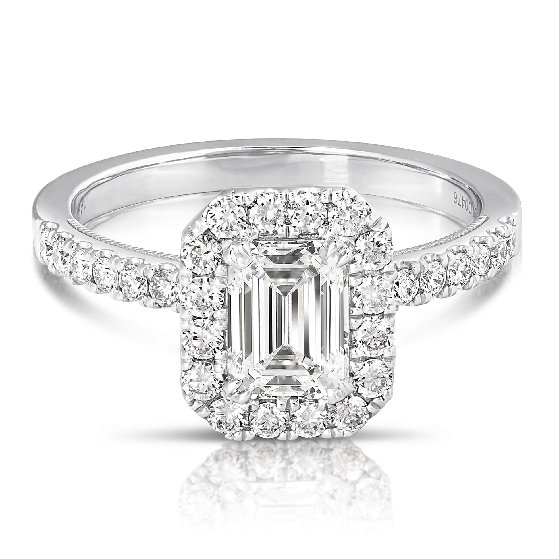 Turn heads with this trendy engagement ring. Ring features one emerald cut lab-grown diamond centrally prong set surrounded by lab-grown round brilliant cut diamonds pave' set in the halo and shoulders of the ring. Totaling 2 1/2CT TW.